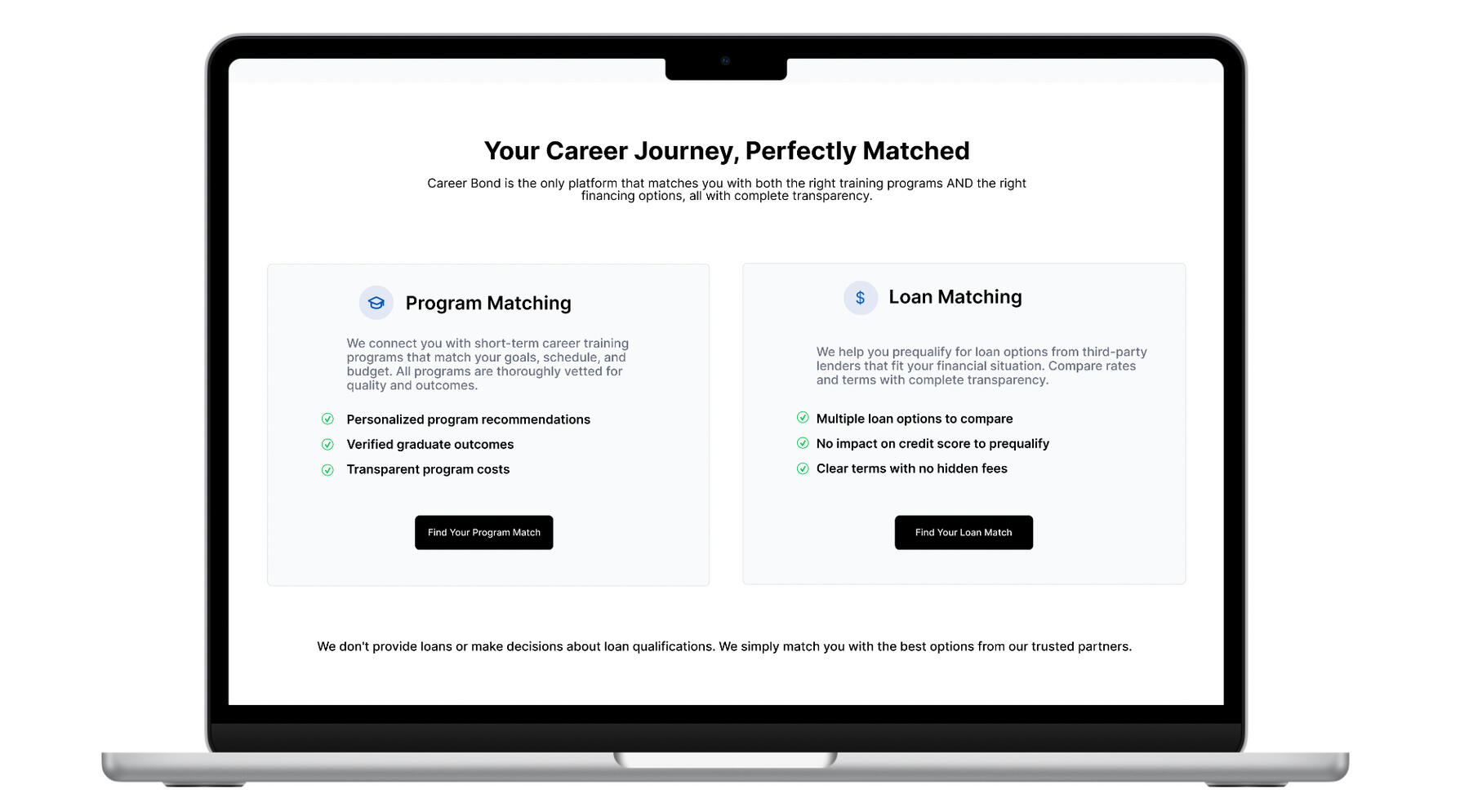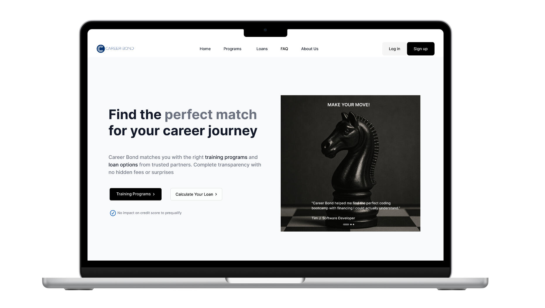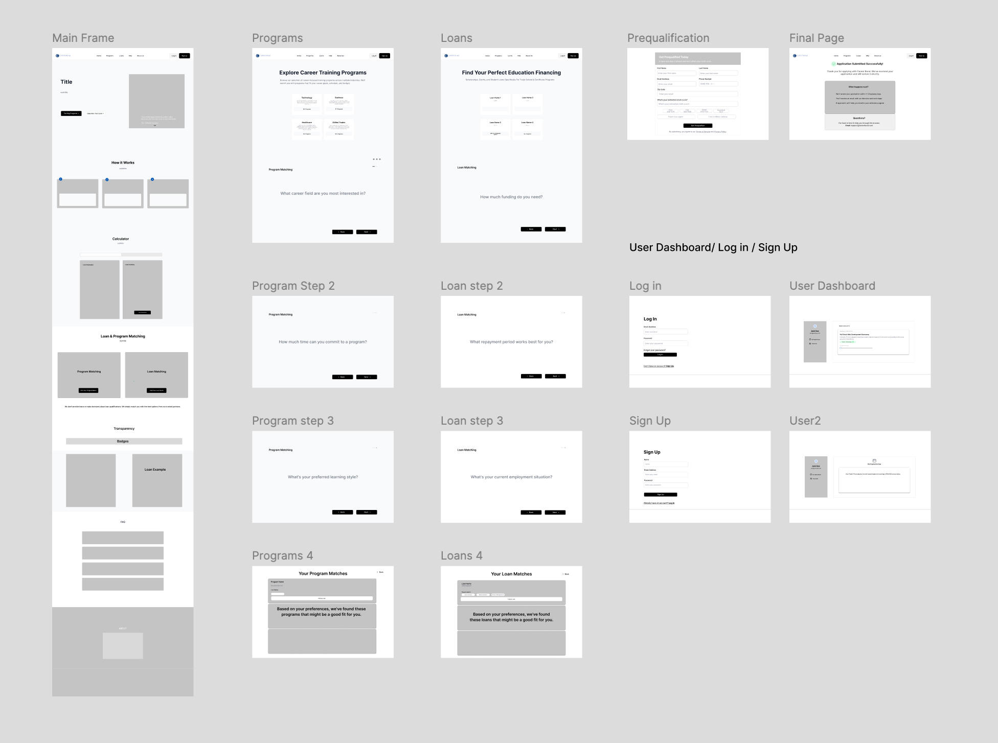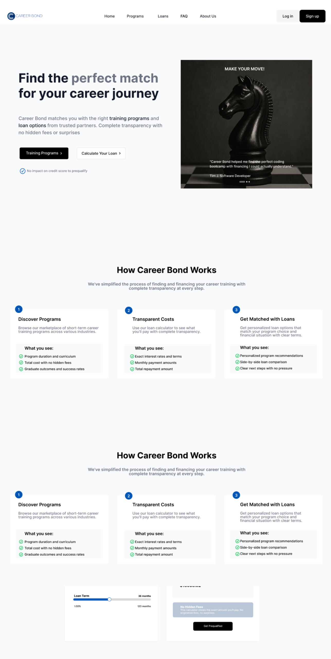 Before defining solutions, I mapped the existing CareerBond website to analyze how users moved through the loan discovery flow. Despite multiple entry points (“Apply Now,” “Tech Careers,” “Allied Health,” “Business Programs”), every button led to the same pre-qualification form regardless of intent or category.