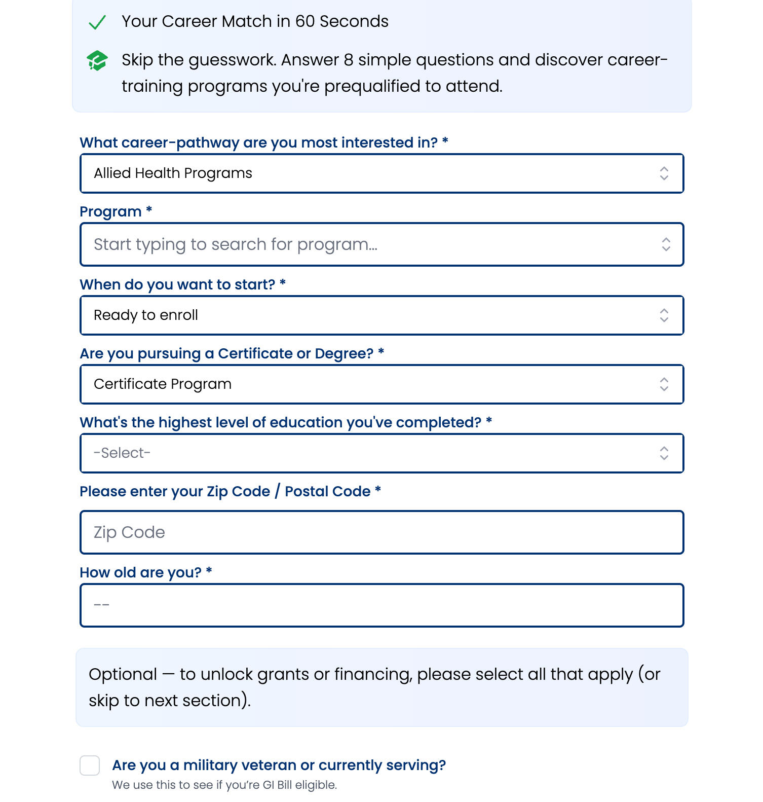 The original toolbar redirected users to the same “Career Goals” form regardless of their intent. I restructured the entry points to distinguish between program discovery and loan options, preventing unnecessary repetition and user frustration.
